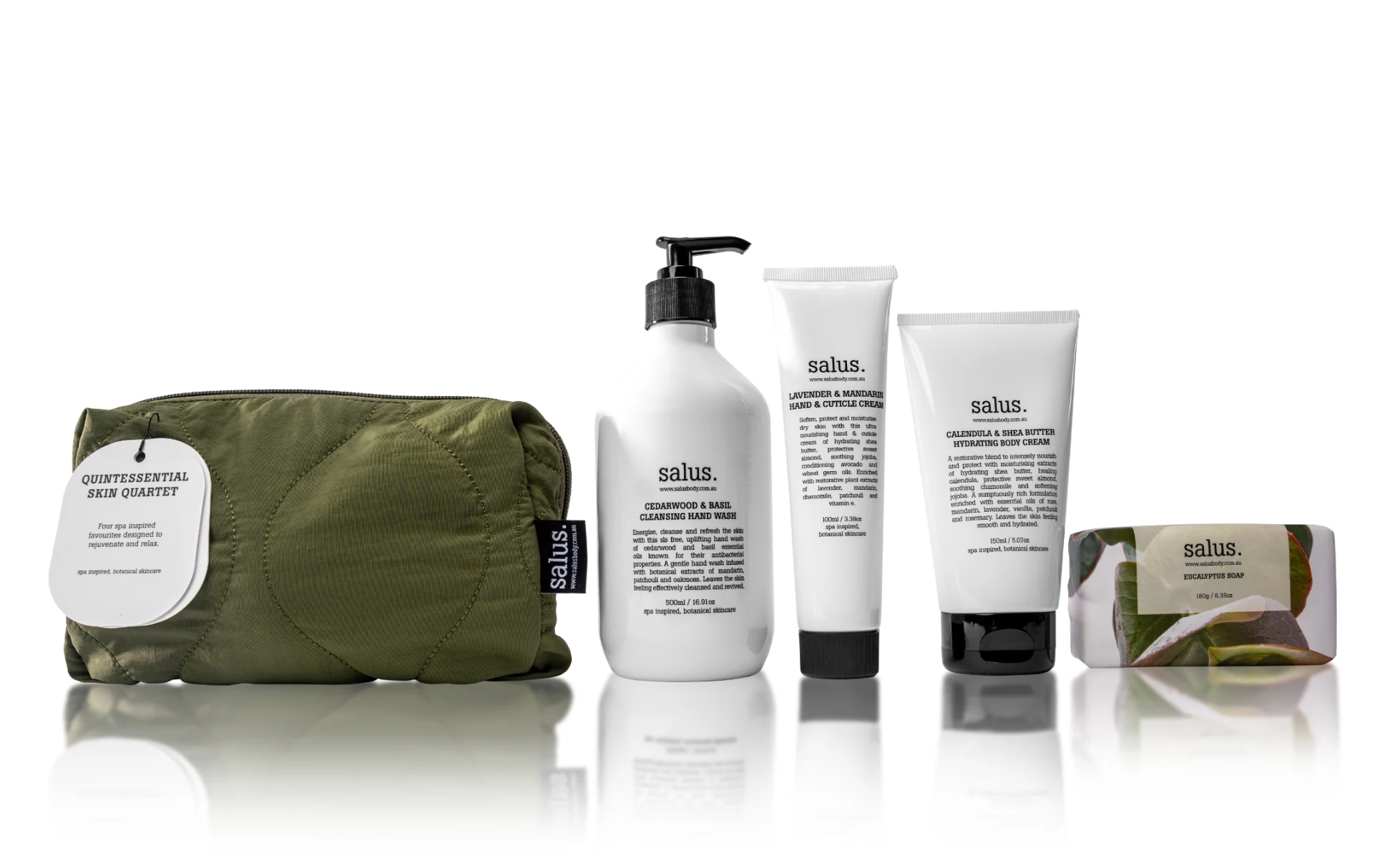 A luxe curation of hand and body essentials, designed for full-body nourishment and refinement. This set contains a Cedarwood & Basil Cleansing Hand Wash 500ml, Lavender & Mandarin Hand & Cuticle Cream 100ml, Eucalyptus Soap 180g and Calendula & Shea Butter Hydrating Body Cream 150ml.