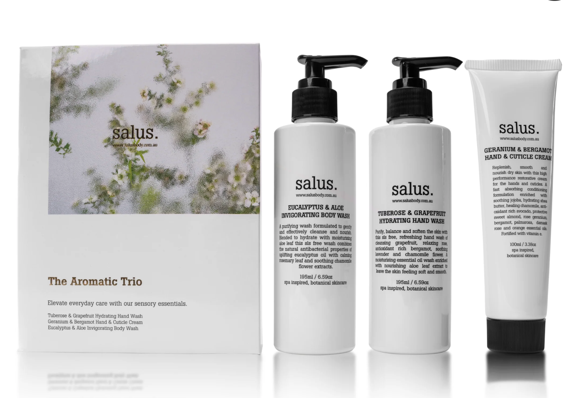Tuberose & Grapefruit Hydrating Hand Wash 195ml / Geranium & Bergamot Hand & Cuticle Cream 100ml / Eucalyptus & Aloe Invigorating Body Wash
